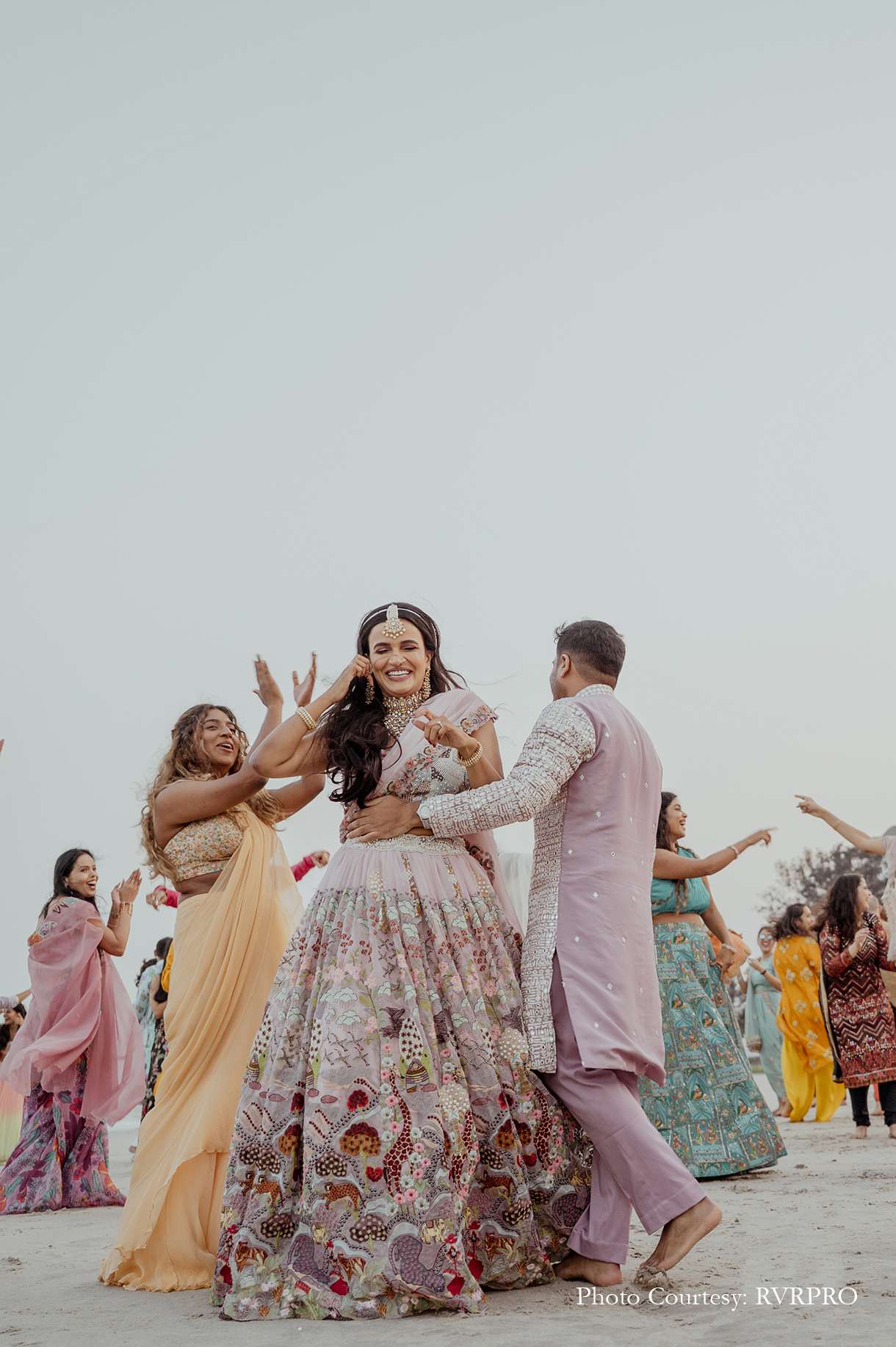 When in Thailand, a beachside celebration is essential! And, with their shared love for beaches, the couple had a blast as they shook a leg by the waves. Playing their favorite tunes and cheering their loved ones who thoughtfully performed a flash mob, Bhavya and Prahlad kicked off their celebrations in style.