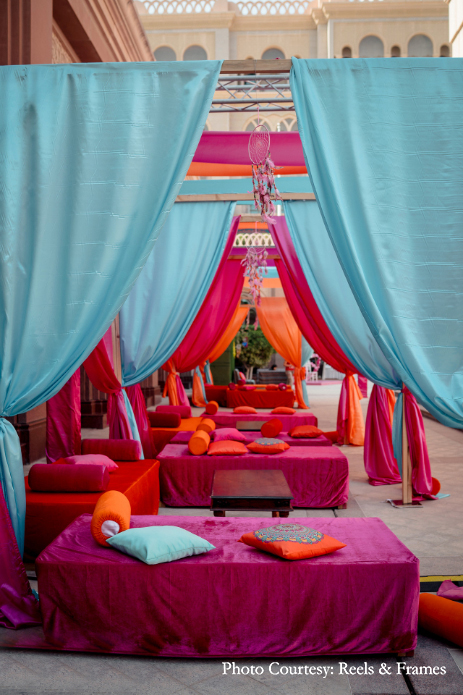 Décor: Kkings Events (Cocktail Party, Kankotri Lakhvanu, and Sangeet, Mehndi, Umrao Night, Brunch and Wedding) Swaaha WMC (Cocktail Party, Mehndi, Umrao Night, Brunch and Wedding), Dome Occasions ( Sangeet)