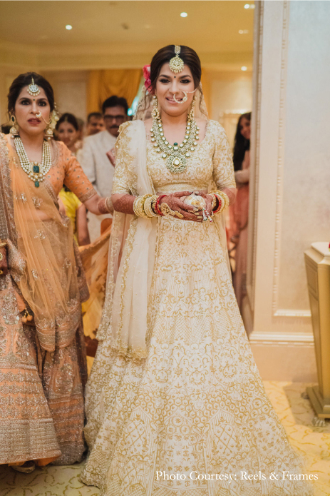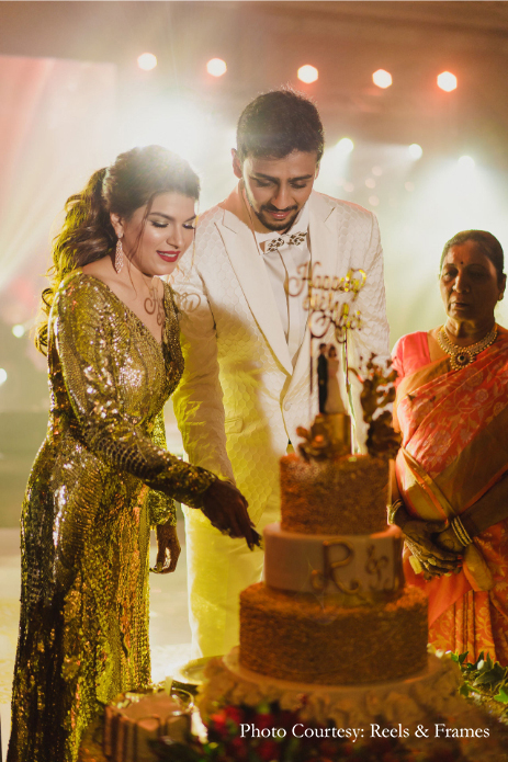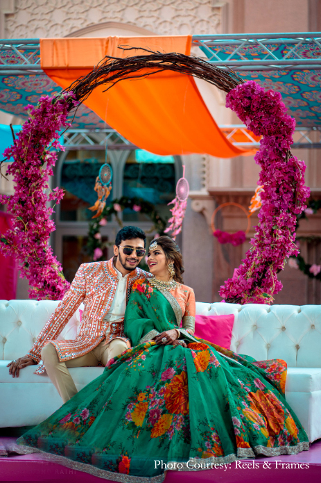 “Grandeur and luxurious, our sangeet was called ‘The Royal Reveal.’ Tunes by hit singers such as The Meet Bros and Manasi Scott elevated the glamour quotient. Power-packed performances by our loved ones made this event an affair to remember. The decor by Kkings Events along with Dome Occasions spelled sheer opulence! Ruchit and I both wore Manish Malhotra outfits for this function.”