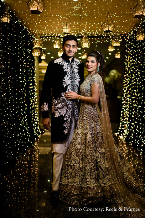 “This evening was an ode to love whose ambiance was created by soulful music as guests were welcomed with bands of fresh ‘mogras’ (jasmine blooms). Our entry for this event was extremely beautiful as we walked hand in hand with a group of graceful Arabic dancers. Shaayris, dance performances, and magic is everything this event was made of! The decor followed the Arabic theme effectively and we also arranged for a photo session, where guests could click pictures with a snake. I looked like a Mughal bride in a golden sharara by Rimple and Harpreet Narula while Ruchit was dapper in a red Shantanu & Nikhil outfit.”