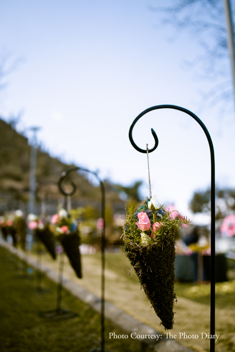 The backyard was perfect for the Enchanted Garden theme of the mehendi ceremony. Featuring a pastel palette, the area was filled with storybook shelves, mailboxes to leave sweet notes for the bride and groom, a life-sized Jenga and hopscotch set-up, gigantic flowers, picnic tables and a stage set for brilliant performances with the backdrop of those mesmerizing mountain ranges.