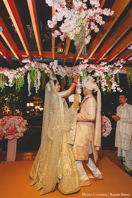 The couple exchanged wedding vows under beautiful arches of a mandap laden with flowers.