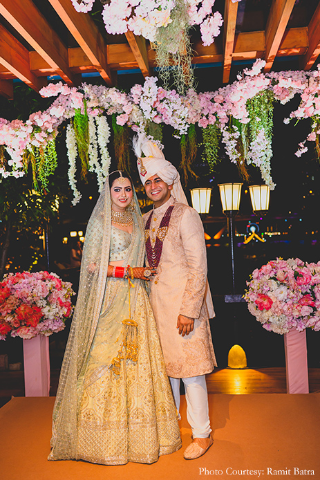 For their wedding, the couple picked four different venues for different rituals. The baraat saw Ashish enter the hotel in a vintage car wearing Achkan by Raghavendra Rathore. After the milni, all guests proceeded to the deck near the pier of the Chao Phraya River for the varmala. Shreya’s made her entrance in an authentic Thai boat, wearing a beautiful, pastel-green Sabyasachi lehenga.