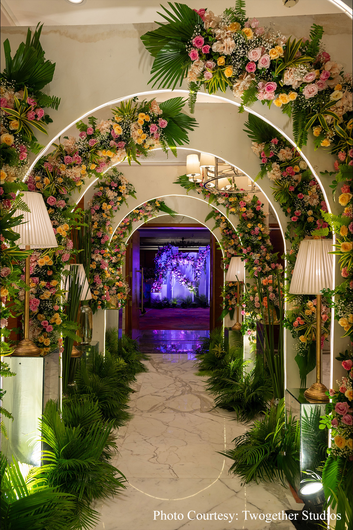 Using a vibrant palette of yellow, green and white, the haldi was a playful celebration. A flower shower and candid banter resulted in picture-perfect moments against the floral backdrop, which also had the couple’s hashtag.