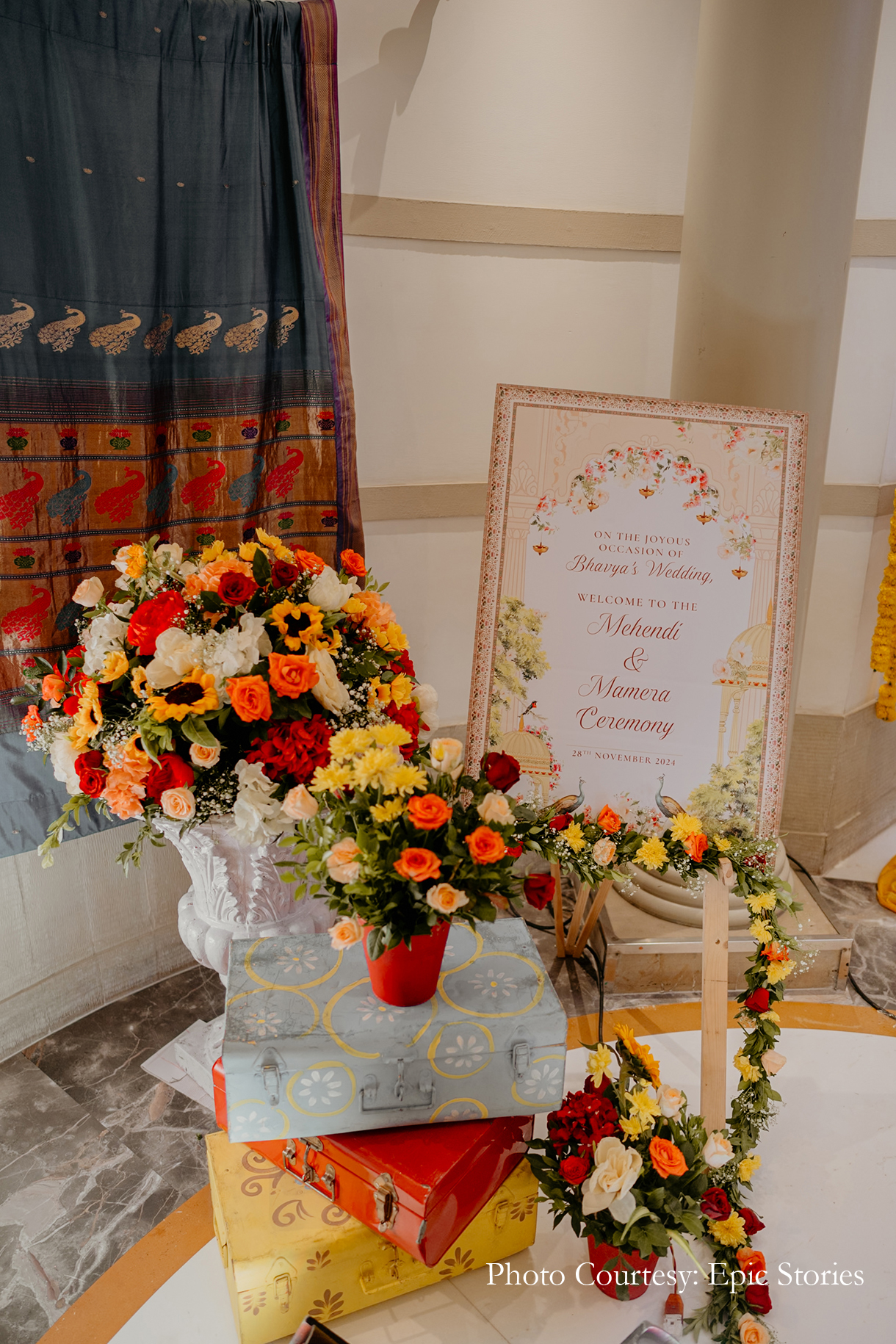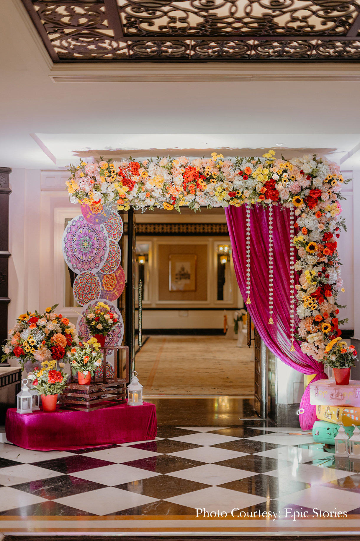 The Myra was hosted indoors with minimal floral decor. The entryway looked vibrant with its colorful blooms, mandala-inspired prints, crystal hangings and quirky decor elements.