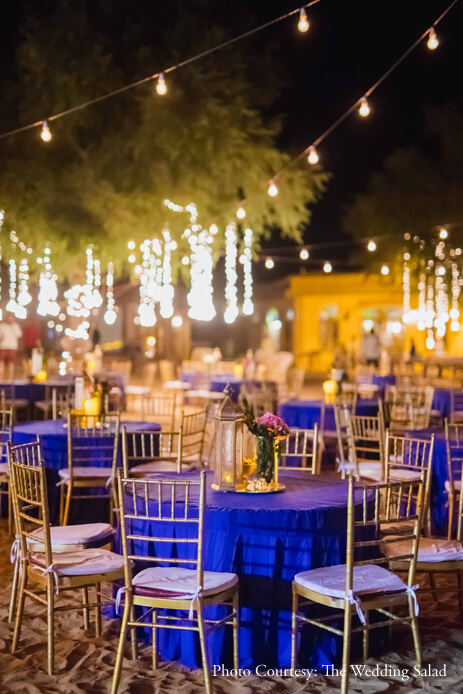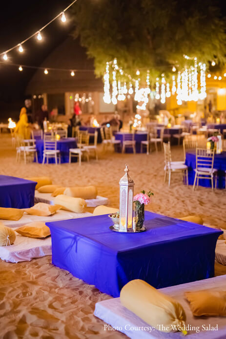 A Moroccan themed night in the desert is a match made in heaven. At the sangeet, this spot in the Thar Desert was lit up with yellow bulbs as yellow and blue décor accents created a little Arab magic. The bride and groom matched each other but were in contrast to the venue’s palette – Arushi wore an opulent pink lehenga while Karthik wore a pink sherwani with dhoti pants.