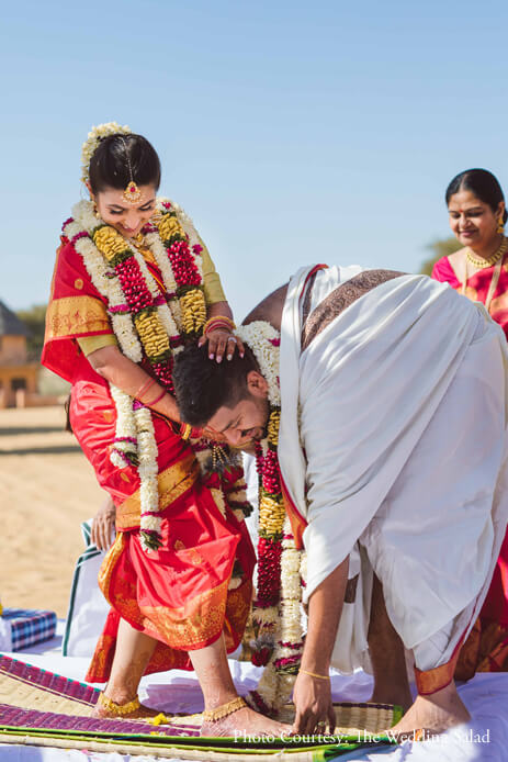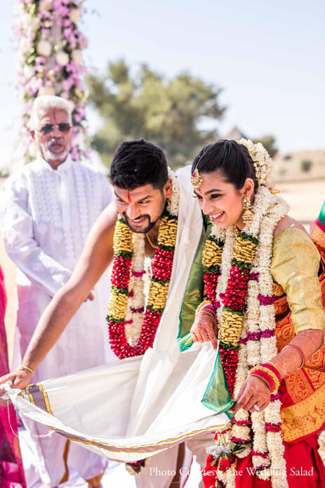 “The Tamil Kalyanam was set up beautifully in the middle of the Thar desert and was followed by a Sadhya lunch. Decked with flowers, the mandap had a traditional, minimalist aesthetic with bells and orchids suspended from the ceiling. During the Kanyadan, Tamil tradition dictates that the bride sit in her father’s lap. It was an emotional moment for me. However for the Jaimala, where my brothers lifted me up had everyone grinning and laughing.”