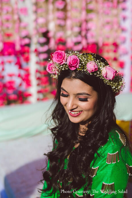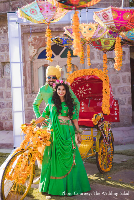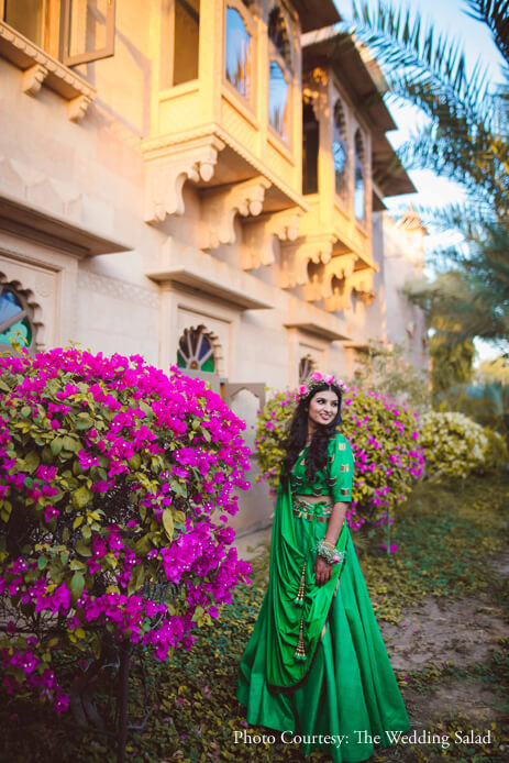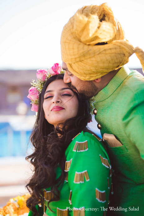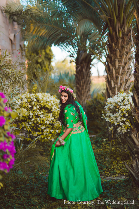 Arushi and Karthik coordinated their attire with the décor with the bride in a green Kalki lehenga teamed with elegant floral jewelry and a green Jinam sherwani for the groom.