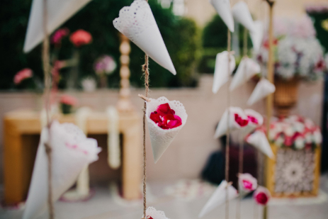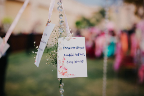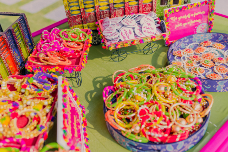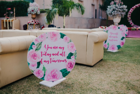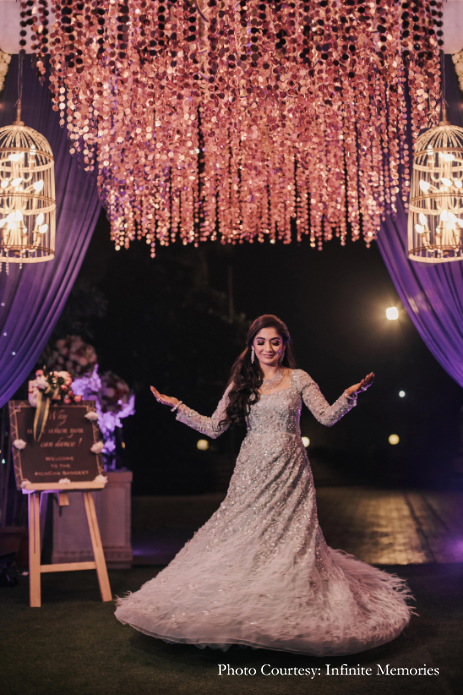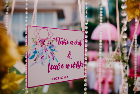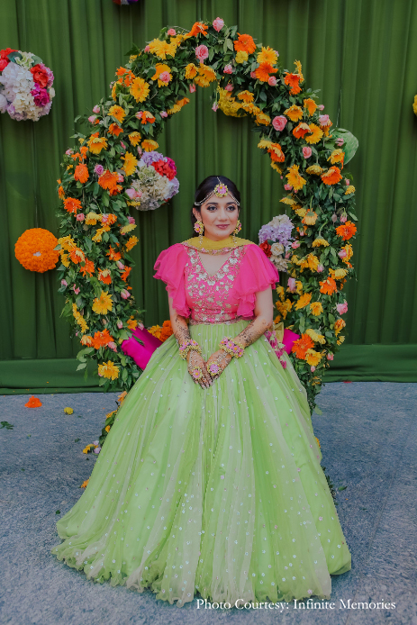 The fun and vibrant mehndi was held at The Umrao, a four-star property in New Delhi, which is spread across 15 acres and includes beautifully landscaped gardens. Bright decor elements like marigold garlands and quirky umbrellas lit up the outdoor venue. Chandni and Ichchhit both opted for outfits by Sneha Lochan Couture for this event. The bride paired her green and pink lehenga with floral jewellery strung along strands of pretty pearls.