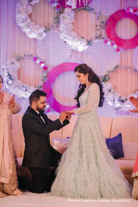 The swanky engagement ceremony saw lots of shimmer and glam at the beautifully decorated Udman by Ferns N Petals, which is a charming boutique hotel in the capital. The bride-to-be wore a gorgeous grey gown with a feathered hem by Natasha Dalal, while her fiance donned a sharp Gaurav Gupta tuxedo. The couple even cut a three-tier cake that was decorated with their black and white photos.