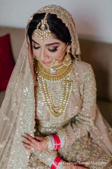 Keeping it traditional for the Sikh wedding which was held at The Umrao, Chandni wore a heavily embellished pastel pink and gold lehenga by Asiana Couture lehenga, while Ichchhit wore an elegant Sabyasachi Mukherjee ensemble. Her well-coordinated jewellery for this function was all about tradition as she wore a ‘maang tikka’ (forehead ornament), large ‘nath’ (nose ring), dangling earrings and a magnificent choker.