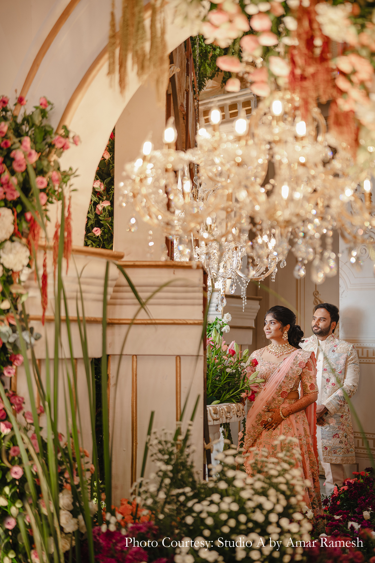 The reception stage featured classical arches softened with abundant florals in shades of blush, coral, ivory, and soft lavender. Crystal chandeliers and warm lighting cast a golden glow across the space, creating an atmosphere of old-world charm. Floral installations were suspended from overhead structures and pillars, enveloping the venue in layers of texture and colour. Statement floral arrangements framed the seating area, while delicate detailing ensured the setting felt luxurious yet inviting.