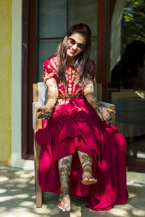 “Our wedding festivities began on a bright and colorful note with the mehndi. The decor included vibrant cushions, umbrellas, and charming flower pots which set the perfect vibe for the outdoor function. Further, the dhol (traditional drums) players had everyone dancing in high spirits!”