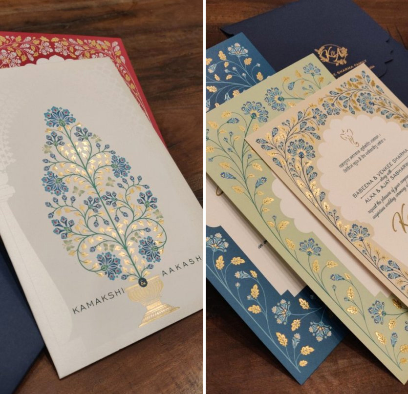 The groom shared, “Niyati and Antriksh from Desert Pearl Entertainment were very good in managing the time difference with us when it came to planning a wedding from the US, and helped communicate and give us numerous options to make choices. They also brought our visions on how we wanted the events to life, and the events looked better than we had imagined.” The team at Turmeric Ink incorporated shades of blue with gold, hand-painted in intricate floral pattern on cream paper. The text beautifully calligraphed in gold ink was resplendent of their luxurious wedding celebrations.