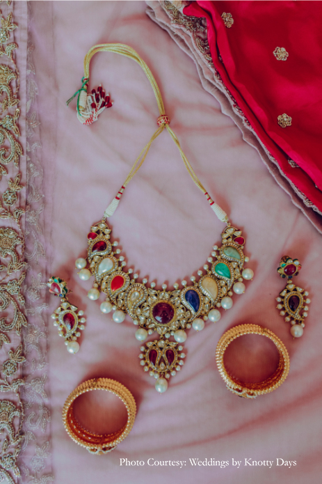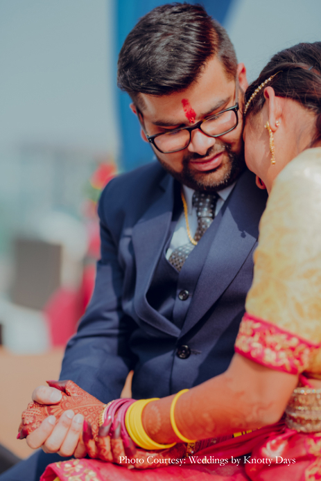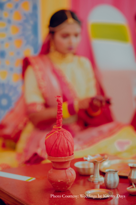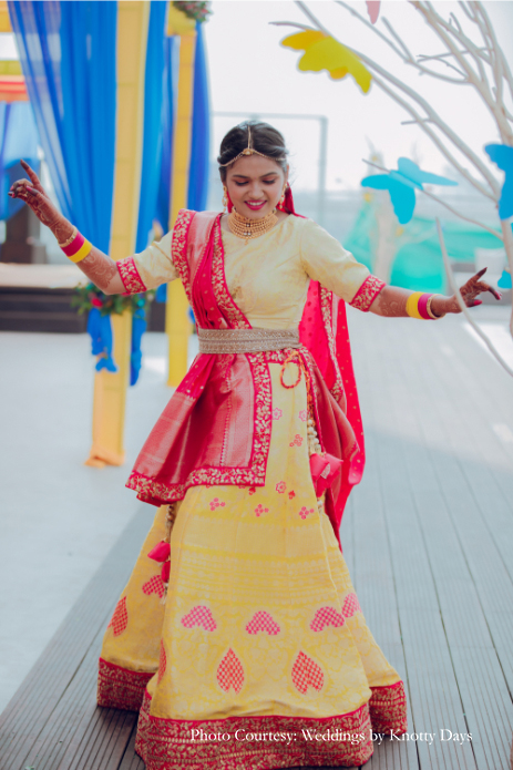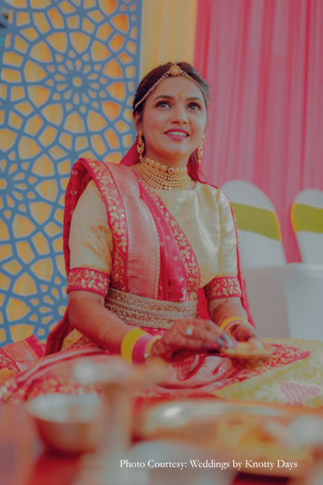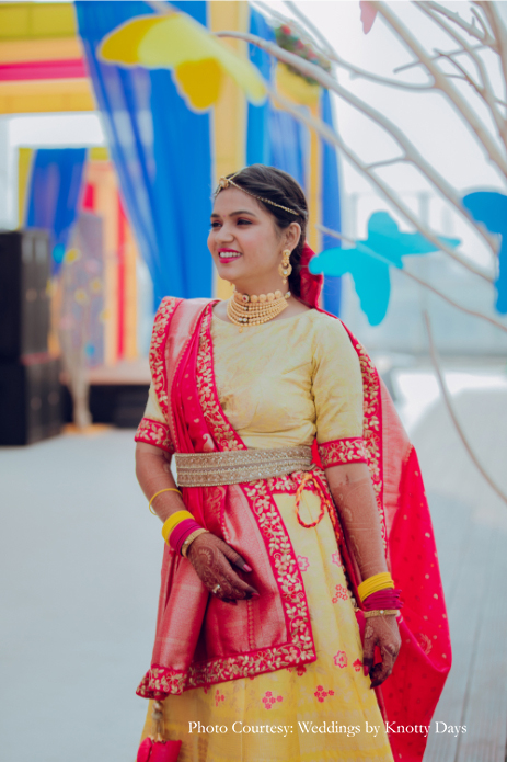 Lisha’s ‘Bhaat’ ceremony was a colorful event that saw lots of gorgeous dreamcatchers used in the decor. The ceremony saw the couple’s families and friends come together and have a fun time, as reflected in the happy images captured by the team at Weddings by Knotty Days. Lisha looked radiant in her yellow and red lehenga that was accentuated by a red benarasi dupatta. Her gold choker and delicate borla ‘matha patti’ (forehead ornament) completed her traditional look.