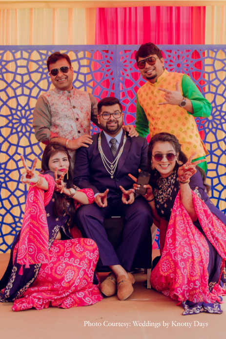 Lisha and Abhinandan’s sangeet was an extravagant affair. The decor was done in shades of purple, shades of purple, and the magnificent stage looked straight out of a Bollywood awards night. Lisha chose to wear her favorite color – yellow. Her sunny Lucknowi gown with grey mirror work made for quite a pretty sight. Abhinandan, on the other hand, looked dapper in his military green Indo-western sherwani.