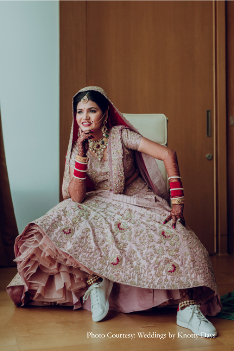 Lisha and Abhinandan’s nuptials were a day ceremony with the couple performing their pheras under the blue sky. The color scheme for the ceremony was centered around pastel shades and included elements like drapes. The bride entered the ceremony escorted by her father and brother. Lisha looked gorgeous in a dreamy pink lehenga that replicated her mother’s bridal demeanor. She balanced the look with a maroon veil fixed on top of her head. The embroidery on the lehenga was in light gold zardozi. Abhinandan also looked splendid in a peach and cream sherwani and a matching turban.