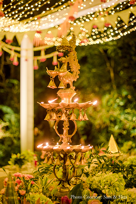 From dazzling disco balls to glowing South Indian brass lamps, this couple's nuptials fused East & West decor elements beautifully.
