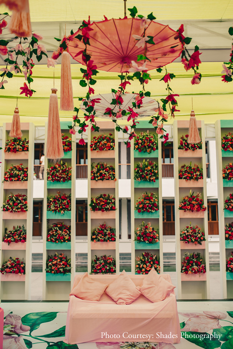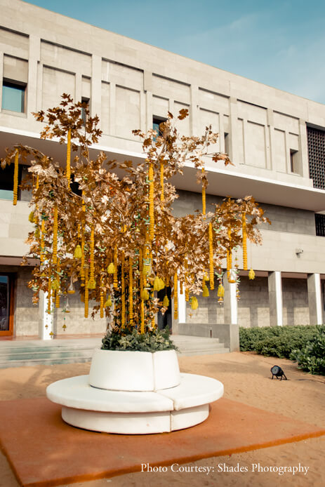 Keeping in mind the emotions of the guests, the interiors for this ceremony saw vibrant hues decorate the venue, reflecting the joy and goodwill as elders gathered to bless the newlyweds. Members of the family donned shades of saffron and white. The décor featured flowers and origami elements, bringing out a wonderful contrast in colors and textures, and giving the ambience a perfect blend of traditional and modern culture.