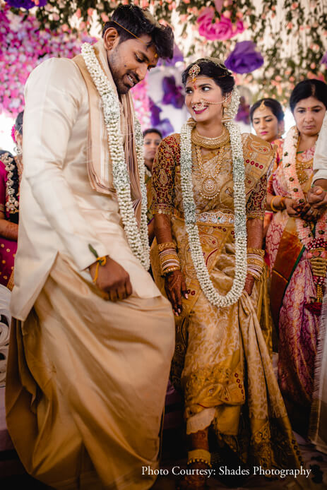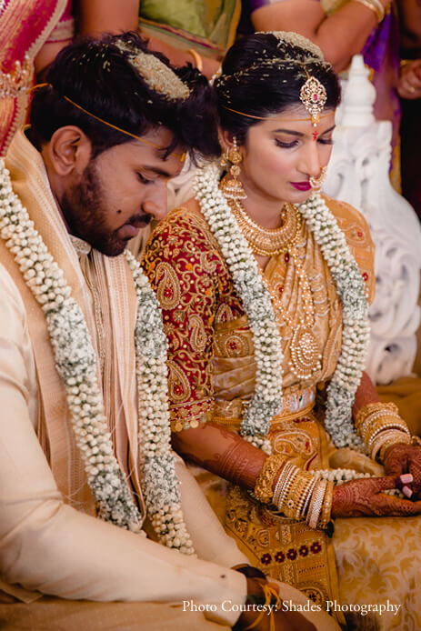 During the second half of this ceremony, the couple sported a different attire to complete the marriage rituals. Wearing shades of cream and gold, both Aakash and Manopriya looked resplendent in their traditional outfits.