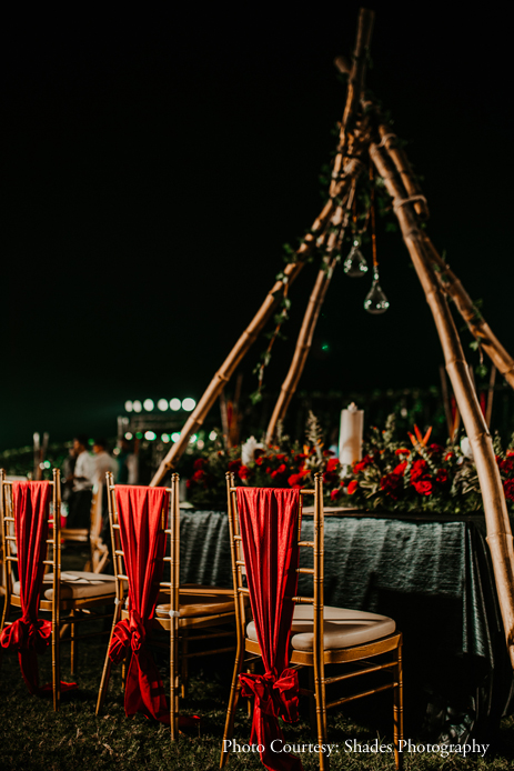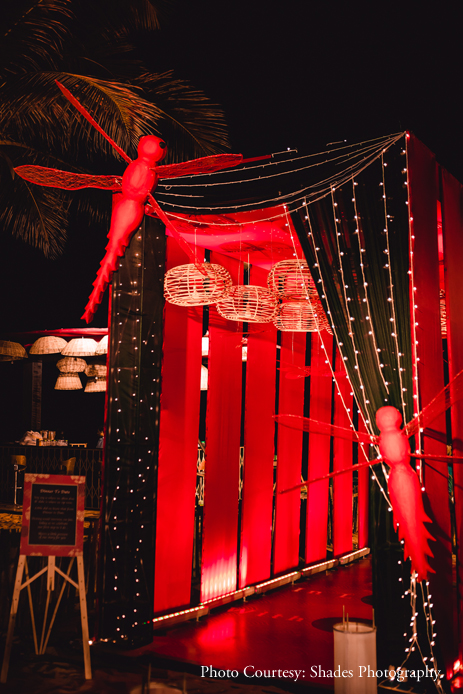 “The sangeet function kickstarted our wedding celebrations. The décor was inspired by the Soy Soi restaurant in Chennai, which is where we had our first dinner date. The color red dominated the decor at the venue, along with bamboo lanterns and dragonflies which were scattered around to emulate the interiors of Soy Soi.”
