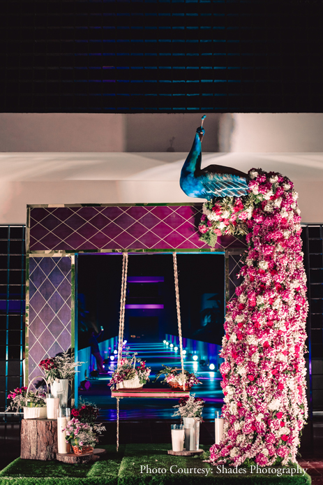 The décor for this function was wonderfully executed by The A-Cube Project, which featured elaborate floral hangings. The décor featured elaborate floral hangings teamed with huge roses suspended from the ceiling. Beautifully-crafted peacocks with feathers made from intricately-arranged blue and purple flowers were positioned as a stunning vertical backdrop on the stage. The awe-inspiring beauty of the InterContinental Chennai Mahabalipuram Resort was enhanced by the stunning natural surrounding of golden sands and the bright blue sea.