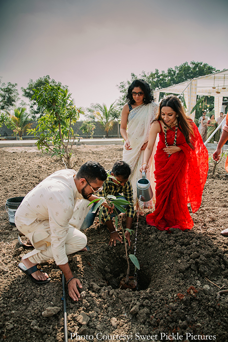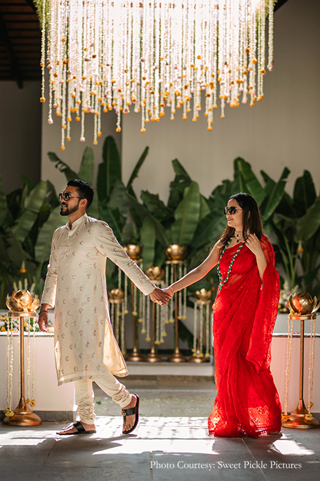 “We wanted to ensure that every detail was taken care of perfectly well. Fortunately, every vendor we’d hired delivered their best services as can be seen in our stunning photos. We had two, very simple and intimate events. We had the marriage registration at the farmhouse during the daytime, and an afterparty at my house which went on till about 9 am the next morning. To mark the new beginning of this exciting phase in our life, we went around the farmhouse and we potted plants in selected locations. Alex and I wore Anushree Reddy and Sabyasachi for the wedding ceremony respectively.”