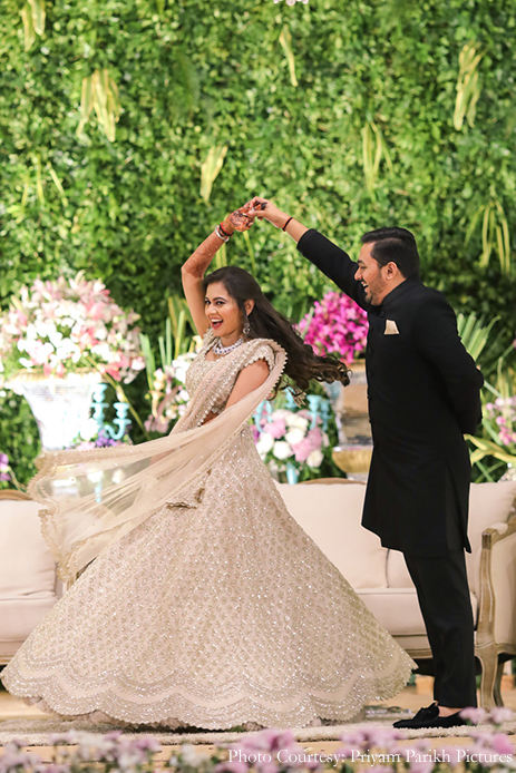 The festivities concluded with a grand reception that saw opulent decor consisting of crystal chandeliers, a massive verdant backdrop and a canopy of tassels framed under a gargantuan structure that had elements inspired by ancient Indian architecture. The bride wore a dazzling silver lehenga with diamond jewelry, while the groom looked suave in an all-black outfit.