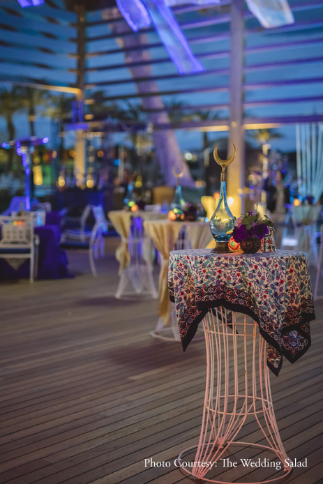“This was an evening dedicated to the location of our wedding – Turkey. We wanted our guests who had traveled all the way to Antalya to get a taste of the local culture, and there was no better way to do so than by hosting a Turkish Night. Local curios and mosaic candle holders along with flowers made for decor centerpieces. Blue and purple were the key colors at this event, and the night was brought to life by some enthralling entertainment acts.”