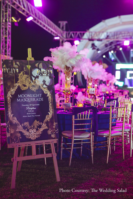 “Themed ‘Moonlight Masquerade,’ our reception was all about old-school charm and a fair amount of drama. The night saw live performances by dancers, and our couple entry was especially noteworthy. We walked in hand-in-hand surrounded by performers walking on stilts, presenting an act with ribbons, and so on, while pyrotechnics lit up our path. Feather plumes were used as part of our decor and masks were placed on the charger plates. This indeed was the perfect way to conclude our festivities.”