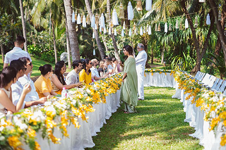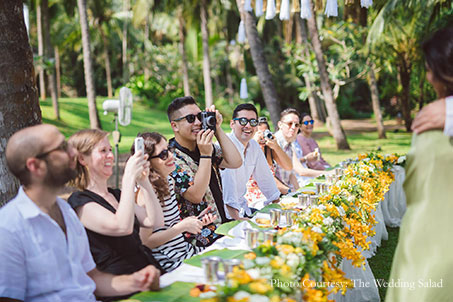 The couple hosted a traditional Kerala lunch called the ‘sadhya’ which was hosted along the hotel’s lawns facing the beautiful backwaters. Rubah looked radiant in an Anamika Khanna outfit, and Siddharth complemented her in a blue kurta from Fab India and a ‘kusavu mundu’ (Kerala-style dhoti). The decor had a color palette of bright yellow and green in the form of fresh floral arrangements.