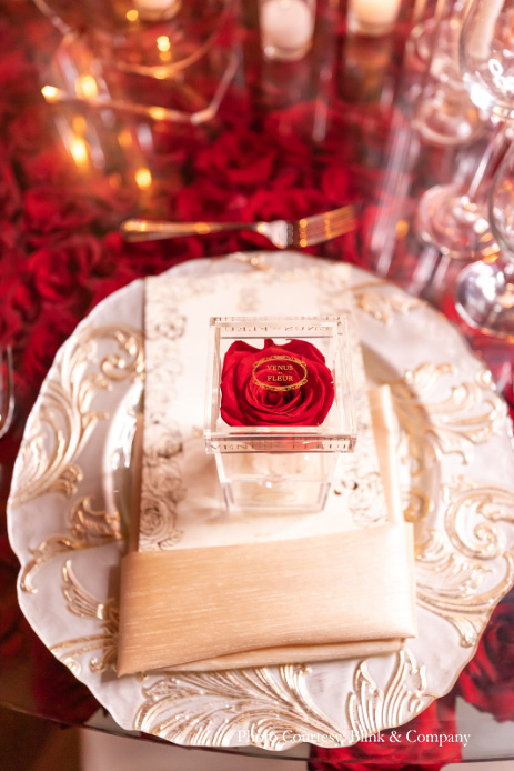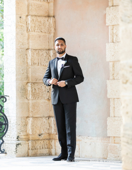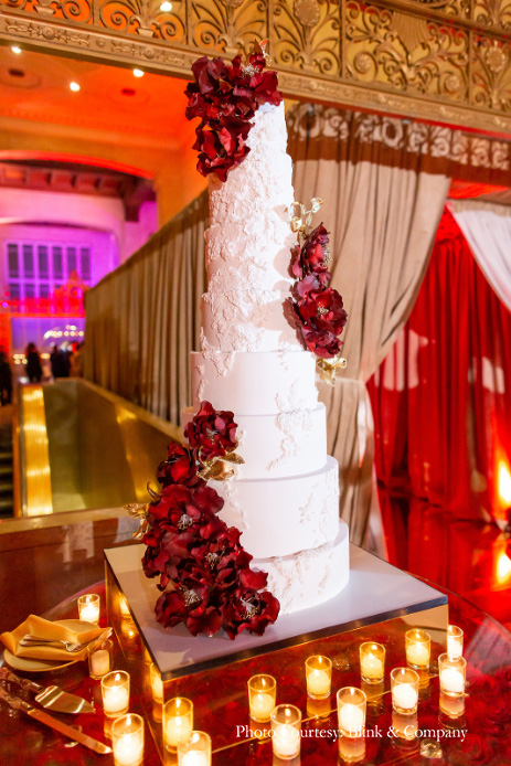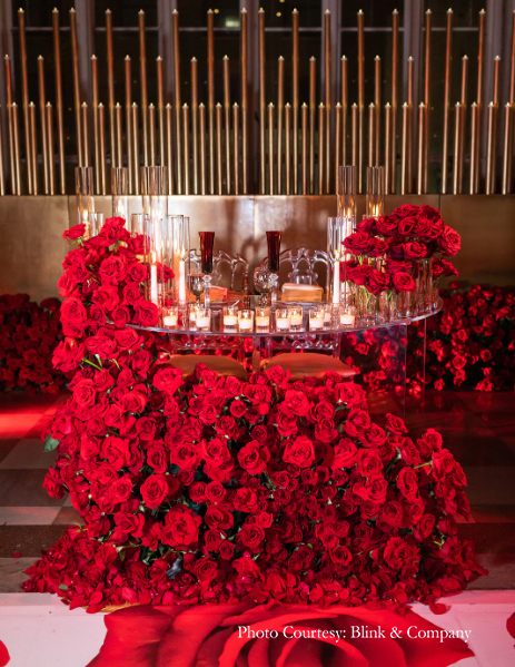 “We wanted our guests who were present at the reception to feel the romance and the love, and we thought there could be no better way to create this feel than by letting red roses and warm candlelights engulf the venue. Our design team truly did an incredible job of bringing this vision to life. At this event, I wore two different Marchesa gowns – one at the cocktail hour and the other for my entrance into the reception venue. For my first dance, I changed into a lehenga by Sajda By Suman. Sunny wore a Dior tuxedo and bow tie.”