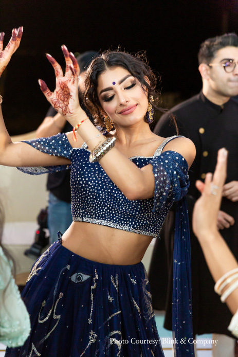 “Paris has a deep meaning to our relationship, especially since Sunny proposed to me over there. Therefore, we wanted our first function to be reminiscent of the French Capital and decided on decor that took the Parisian route. I wore a grey Tarun Tahiliani lehenga with a cape at the event and later changed into a custom, dark blue outfit with constellations and evil eye motifs that I designed with Sajda By Suman. Sunny wore a grey achkan with golden work and then changed into a black one to complement my attires.”