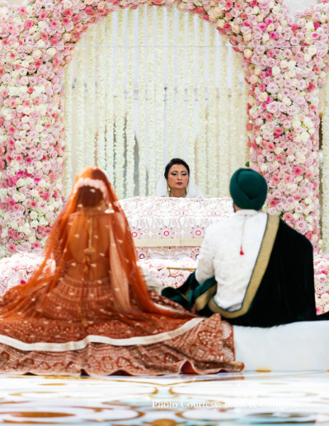 “Our ‘anand karaj’ had a very elegant feel to it, and we created the right mood using pastel hues. The open-air setting ensured that there was plenty of natural light, thus adding to the soothing ambiance. We also made it a point to have flowers from Venus ET Fleur at every event, and they made sure that each setup was unique and appealing. My rust colored lehenga was custom made by Anita Dongre herself who incorporated roses, a special tile design from the Golden Temple and a few evil eye motifs to ward off negativity in the design. Sunny wore an ivory Rohit Bal sherwani. His outfit featured floral designs and birds motifs, and Rohit Bal customized his collar by getting the same tile design from Golden Temple that was on my lehenga embroidered on it.”