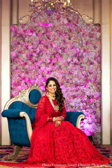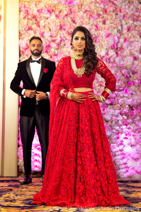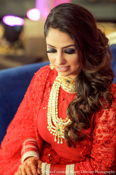 “Red is the traditional color for an Indian bride, and I decided to include that in my trousseau with my choice of lehenga that I wore for the reception. The lehenga’s sheer fabric was complete with tone on tone embroidery and pearl embellishments. The all-red outfit made a bold statement and to heighten its beauty I wore a choker set that was layered over a long necklace. In ordered to match the contemporary vibe of the event, I had my hair styled in large loose curls.”