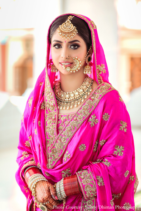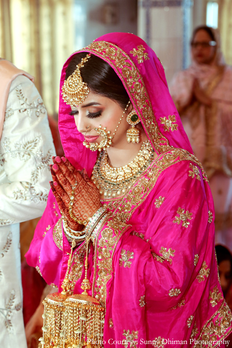 Aman shares, “Punjabi weddings are all about bright colors and lots of cheer. Staying true to the essence of this occasion I decided to wear a gorgeous fuchsia salwar kameez on the day of our wedding. The monotone outfit featured floral designs that were created using golden threads and zardozi. I matched this with heavy polki jewellery and golden kaleerein.