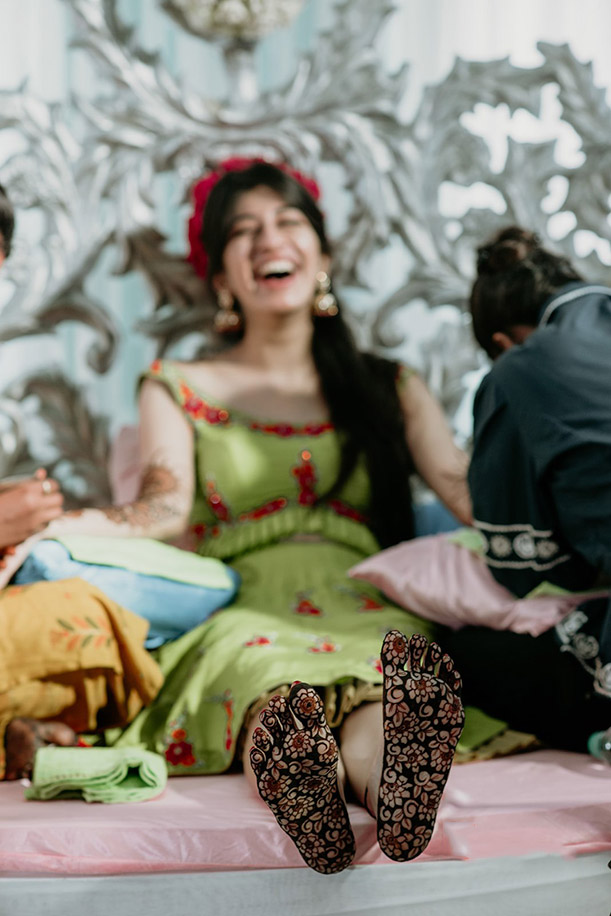 “For my mehndi, I always wanted to wear a multi-colored lehenga with a lot of ‘kalis’ (stripes), each of a different color. I found my dream outfit at Gazal Gupta in Delhi and customized it with velvet elements. The lehenga had huge ‘latkans‘ (tassels) that I customized with our names, and paired the outfit with ethnic shoes from Rohan Arora, that said ‘Pataka Dulhan.’ I wore Polki jewelry and kept my hair and makeup fresh and casual. The color palette of the function was largely Tiffany blue with a hint of floral elements. I walked in holding my dad’s hand to the song ‘Dilbaro!’ It was a very emotional experience.”