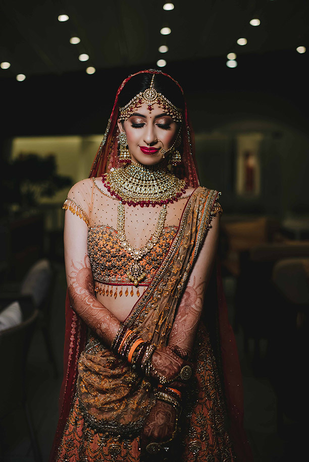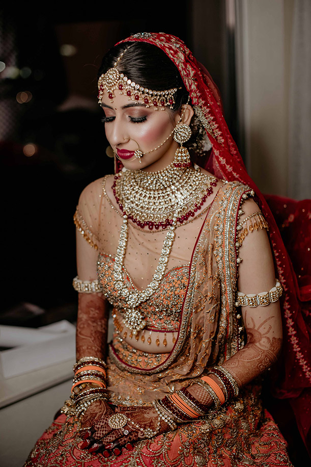 “I always loved Tarun Tahiliani’s work for its delicate and beautiful craftsmanship and knew my wedding lehenga had to be from him. I chose one in red and peach with intricate embellishments and paired it with an elaborate matha patti, layered necklaces, and long jhumkas. I even wore a ‘baju band’ (arm ornament), ‘haath phools’ on both hands, a lot of bangles and felt like a princess. Loveleen gave me beautiful dewy cheeks, shimmering eyes, and a bold red lip that complimented the color of my outfit.”