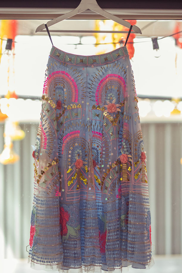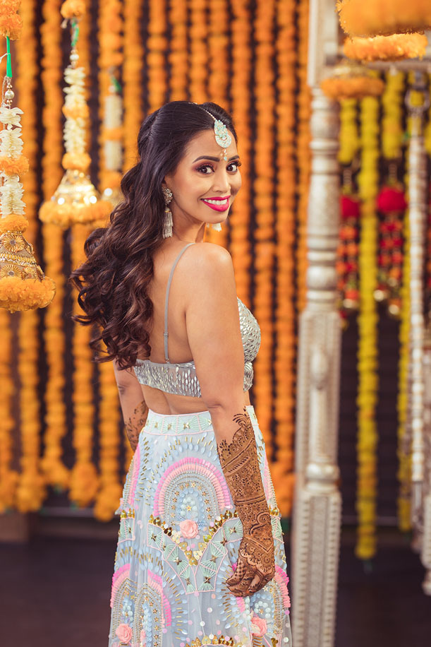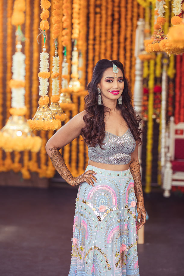 “Since mehndi is such a joyous and light-hearted function, I wanted my attire to reflect a fun vibe. I chose an outfit from Papa Don’t Preach by Shubhika which had a contemporary and funky feel to it. The skirt’s colours and the 3D work really stood out to me, and I paired it with earrings and a maang tikka that I got from the Indian Bridal Fashion Week.