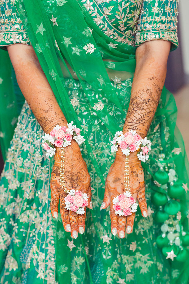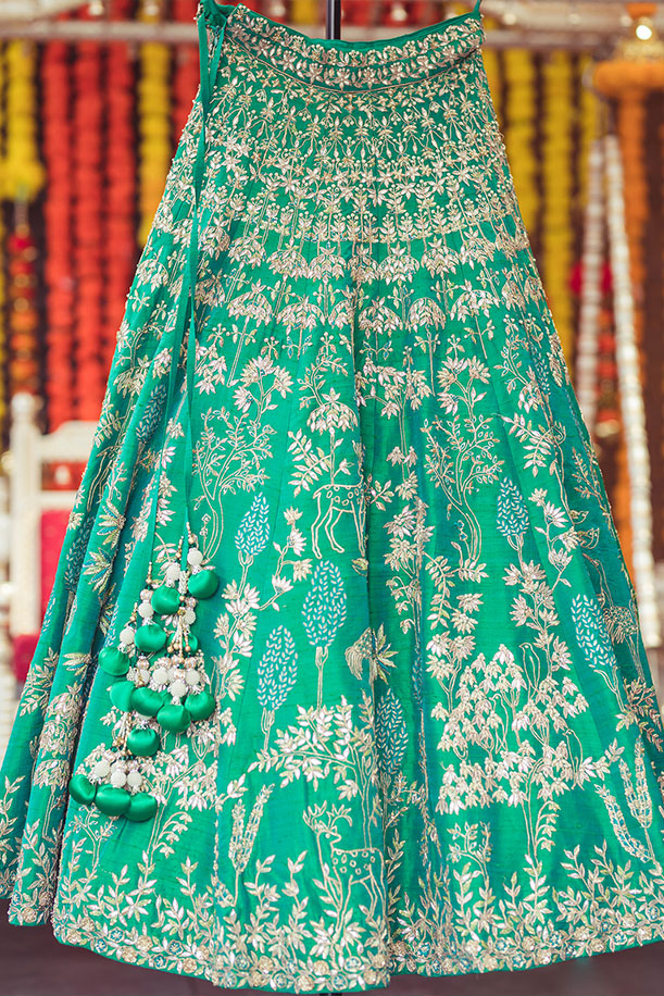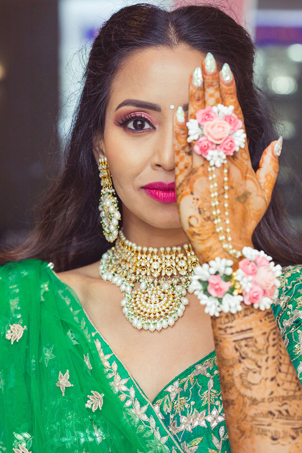 “I wanted to create a fresh look for my sangeet, and opted for a beautiful green lehenga by Anita Dongre. I paired it with a kundan necklace that was trimmed with pearls which I picked from Free Rani in Canada. My hair was pulled into a half up- half down style and the look was perfect for the informal yet traditional function.”