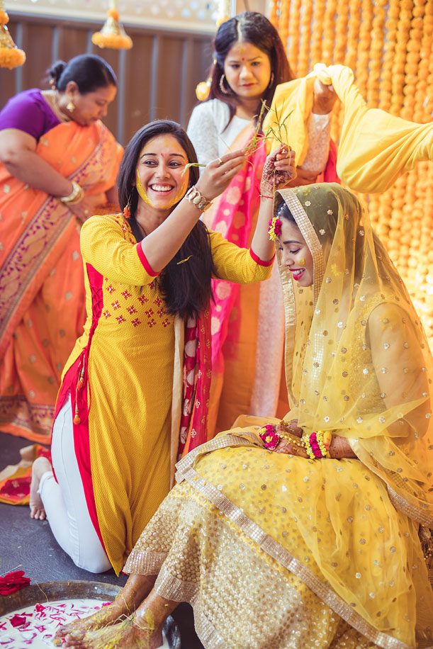 “For the haldi function, I wore two outfits. During the ceremony, I wore a lehenga designed by a Delhi-based friend who put everything together in a week’s time, and the outfit looked so stunning! After the haldi ceremony, I changed into a yellow lehenga by Sabyasachi Mukherjee, and paired it with long pastel green earrings that were designed by me. I believe in DIY looks and find it creatively satisfying to wear self-designed pieces. I did my own makeup for this function and went with a natural look that highlighted my clear complexion. I prepped the skin with face masks from Lancôme for hydration and tied my hair in sleek ponytail.”