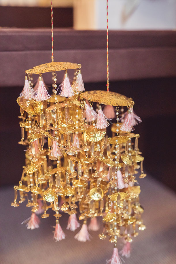 “For the Hindu wedding, I wanted a regal look and when I stepped into the Sabyasachi Mukherjee store in Delhi and saw this velvet lehenga, I knew I had to go for it. It featured crystals and intricate floral embroidery, and I felt like a queen wearing it. I paired the lehenga with the velvet Bengal Tiger cluth from Sabyasachi. My jewellery, especially the heavy earrings and matching maang tikka, was inspired by Deepika Padukone’s bridal ornaments. The most beautiful personal jewellery at this ceremony was my diamond mangalsutra which Arwinder and I chose together. I also wore a set of gold kaleerein with baby pink tassles.”