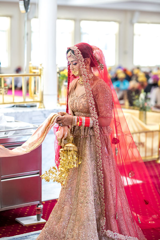 “For the Sikh ceremony, I wore a rose gold lehenga with a long red veil from Rimple and Harpreet Narula. Once again, I opted for a peony and baby’s breath bun accessory which was paired with a pink matha patti and necklace set. Although this was a Punjabi affair, I still wanted to include some pahadi element so I chose to wear a pahadi nath gifted to me by my aunt. These pieces are famous for their large size and intricate design. I had great fun getting ready with Shindy Gill at this event as she did an excellent job by giving me heavy rose gold eye makeup and nude lips for a fresh bridal look.”