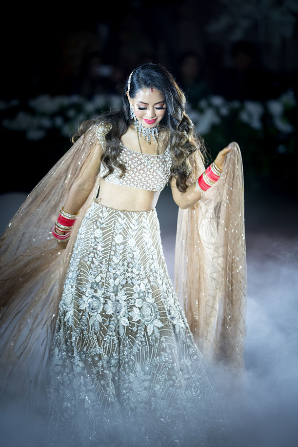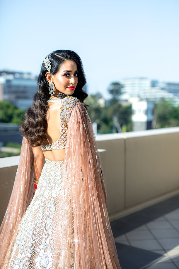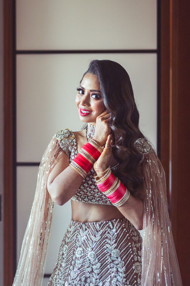 “I wanted the reception look to be glamorous and elegant, and the team at the Manish Malhotra store in Delhi were amazing in the way they suggested just the right outfit for me. They helped me pick a white and nude lehenga with intricate details and pearl embellishments. The blouse had caped sleeves which allowed me to ditch the dupatta without making the outfit look incomplete. I paired this with a velvet embroidered clutch from Free Rani which came from Canada and had ‘Mrs Gill’ written on it. Since the reception look was supposed to be modern, I had Hellana give me an amazing dewy makeup look with bold burnt orange lips. Kelly from Kxhair design styled my hair in a vintage style side parting which I thought looked absolutely lovely!”
