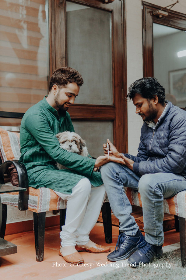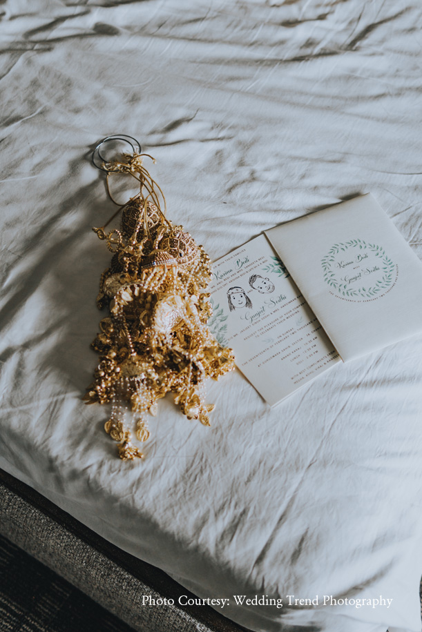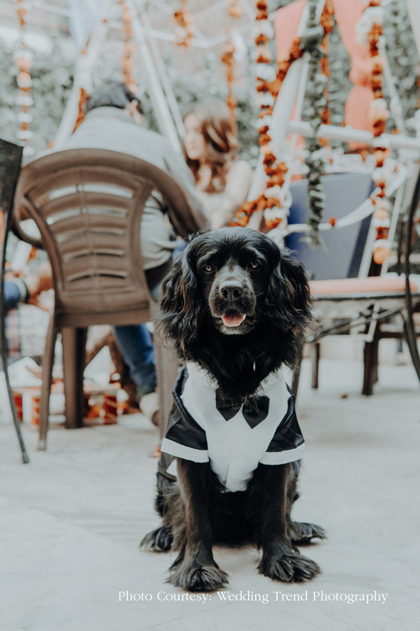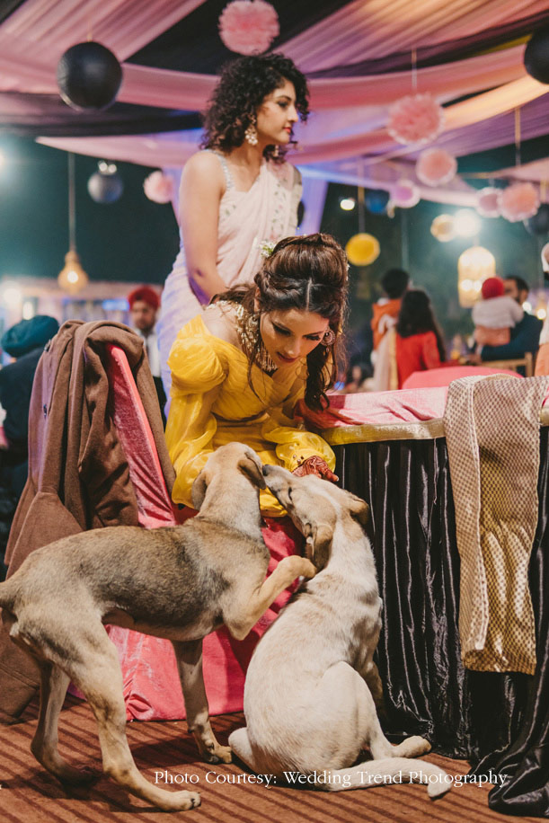 “My outfits for all the three functions were customized by Maksim by Simran. My experience of working with the brand was exceptional. She was the one who helped me plan all the outfits. All I had to do was tell her my requirements and ideas, and she turned them into reality! My husband and I are both animal welfare and rescue volunteers, so we decided to go for low-key celebrations, and use our wedding budget and ‘shaguns’ (monetary gifts) to help our furry friends instead. Our thought was reflected even in our minimal wedding invites and had a whole leaflet dedicated to animal welfare. It also had a QR code that the invitees could scan to donate at a local animal shelter. The invite was designed by The Mixed Fruit Jam, and I recommend them to everyone who’s getting married.”