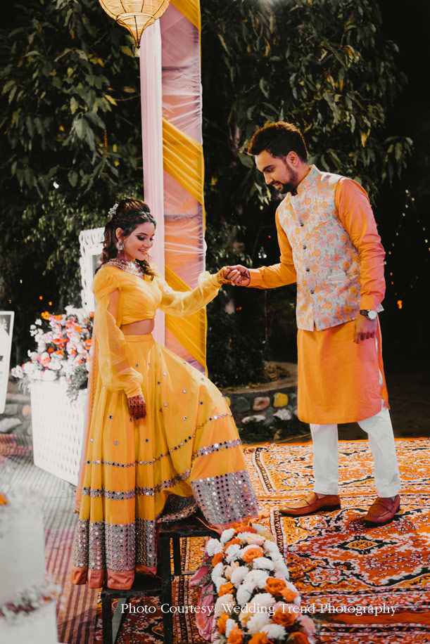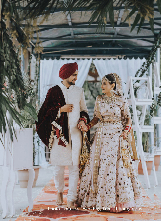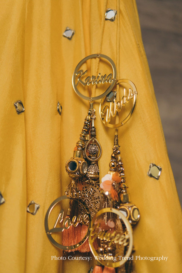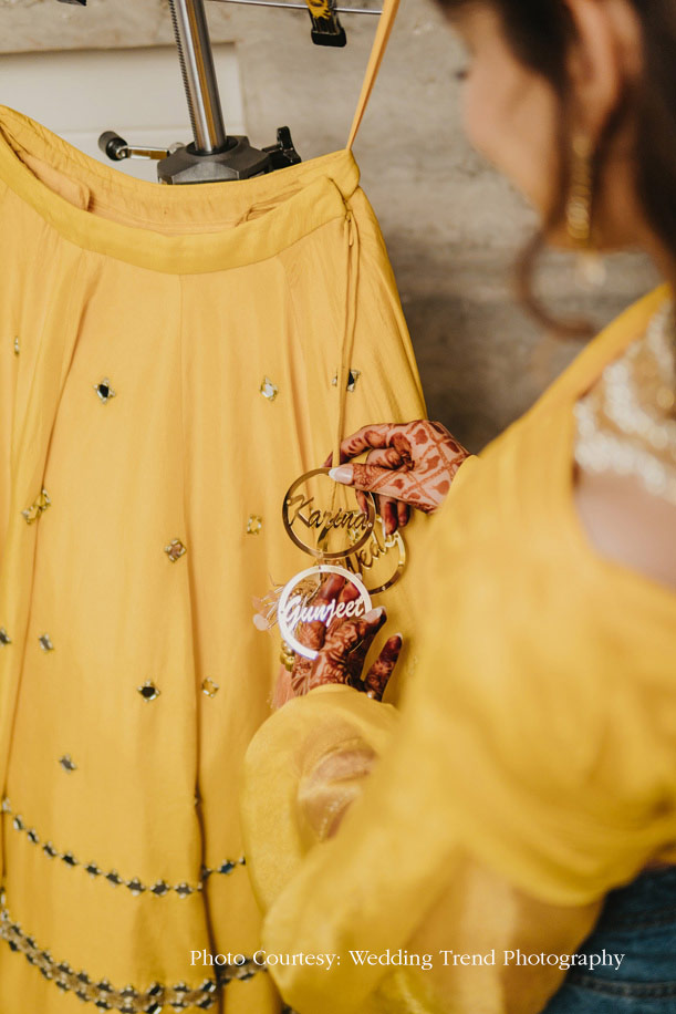 “The sangeet was a grand pastel-themed event, and I wore a yellow lehenga with mirror work on the skirt and a Disney princess-like blouse. This was paired with a peach cape dupatta that doubled up as the necklace and was inspired by Sonam Kapoor’s look in ‘Veere Di Wedding.’ An interesting element in this outfit was the latkan (dangling tassel) which had details that spelled “Gunjeet Weds Karina.” This is was something that made this ensemble very special to me. My makeup was done by Mannat Gill. I was very particular about having minimal makeup on all three days because I wanted to look as natural as possible. Therefore for this event, we went with glossy peach lips alongside soft brown and gold eyelids.”