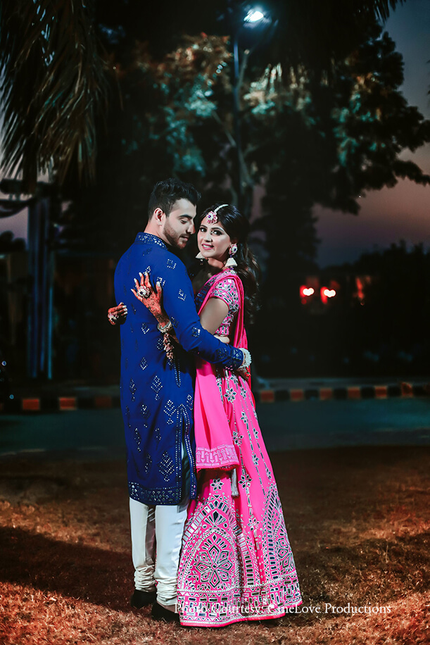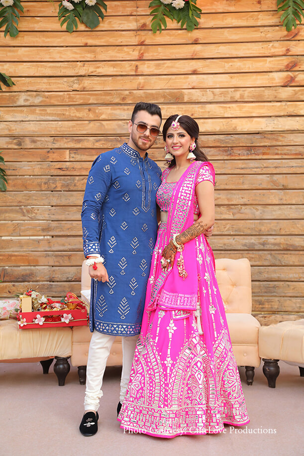 For the upbeat mehndi function, the bride looked radiant in a bubblegum-pink lehenga by Abu Jani Sandeep Khosla. The outfit featured beautiful mirror work that perfectly matched the groom’s blue mirror-work kurta from the same label. With soft wavy tresses, floral jewelry and chic mirrored sunglasses, she was quite the cool bride.