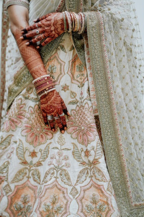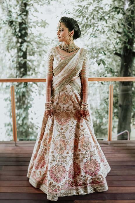 Rooted in tradition but with a subtle, elegant modernity, Rizwana’s bridal trousseau featured classic silhouettes, unconventional colors and beautiful jewellery. Among our favorites were her gorgeous Kanchipuram saree for the mehndi and a lehenga in subtle ivory, gold and pink for the nikaah.
