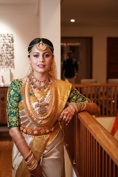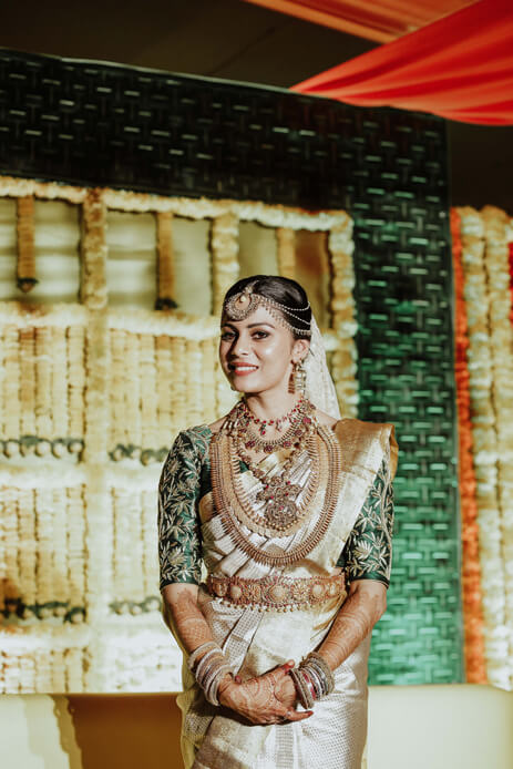 At her pre-mehndi function, Rizwana wore a bandhani half saree but to the temple wedding, the bride showed up totally in tradition. This South Indian bride opted for a Kanchipuram saree with temple jewellery. The outfit, a perfect example of tradition and elegance, was accessorized with statement jewellery including a maang tikka that highlighted the subtle makeup accentuating the bride’s features.