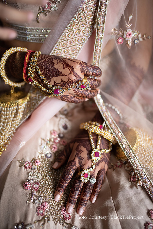When deciding her outfits, Sherina sought inspiration for her looks from celebrity brides like Bollywood stars Anushka Sharma and Priyanka Chopra Jonas, and found all her outfits at premium wedding stores in Delhi. For her makeup looks, she chose to work with two artists. She wanted to glam up for her sangeet, wedding and reception, and booked WeddingSutra Favorite Sejal from Makeovers by Sejal for the same who gave her bold lashes and striking eyes. For her mehendi and boat party, Nui, a local makeup artist gave Sherina a glowing visage. The bride sported distinctive and immaculate hairstyles for all her functions, thanks to the talented Herman from Indonesia. The Bride chose WeddingSutra Favorite – Ima Habsyi to trace beautiful henna designs for her mehndi function.